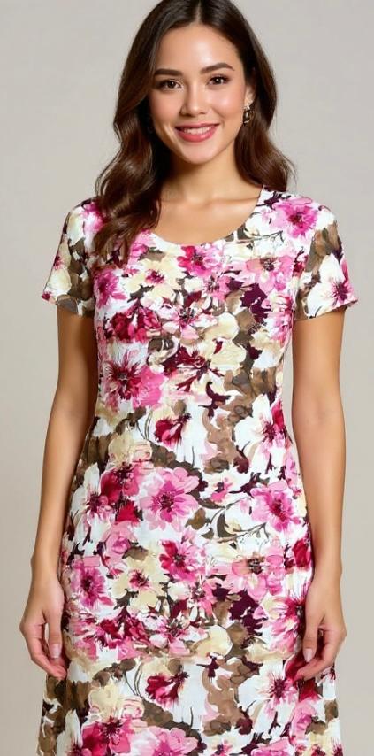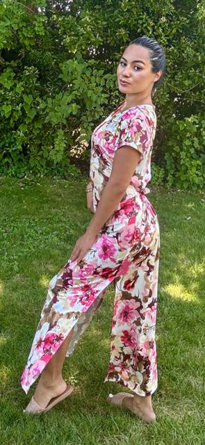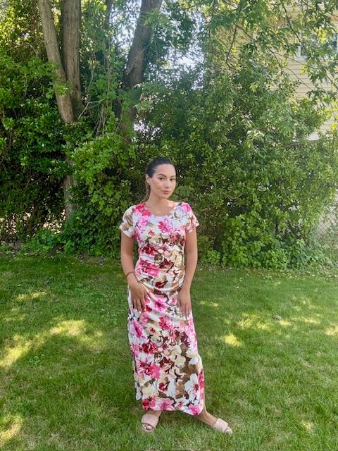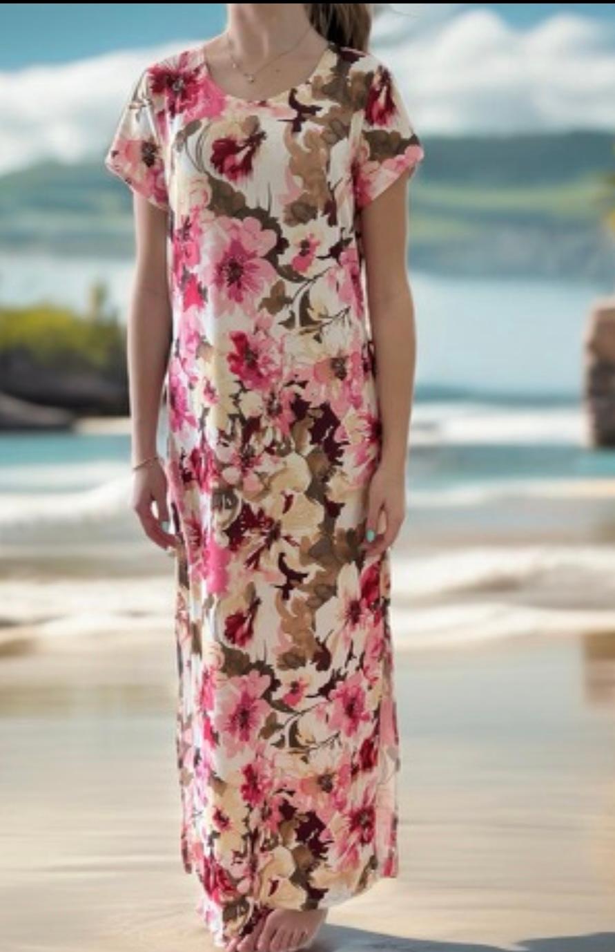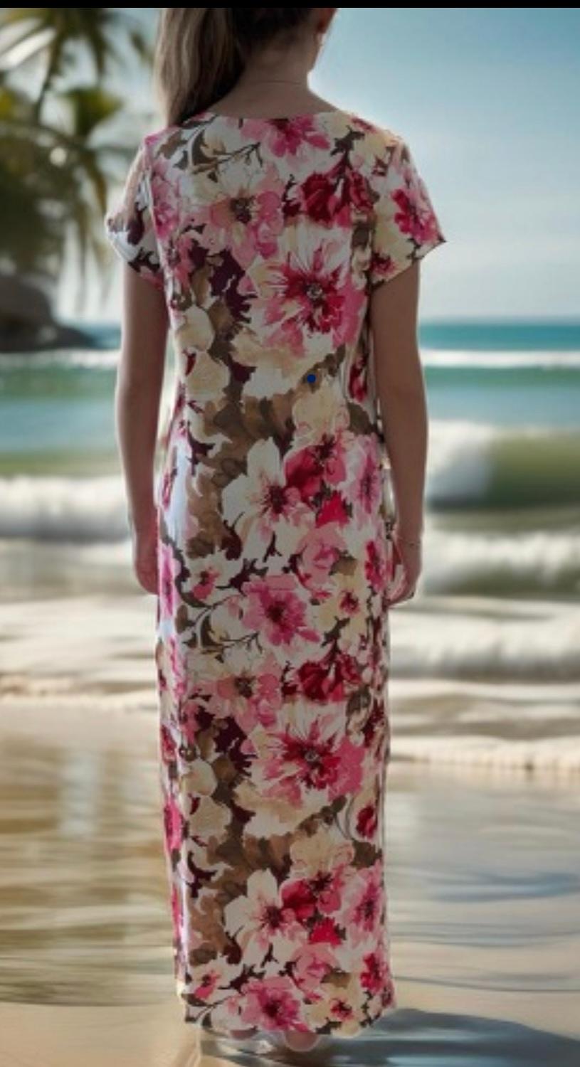 This full length slim fitting dress is made from a fabric that is fuller than almost any other printed polyester/spandex you will find in a store or online. There are slits up both sides to give you an ease in walking or sitting and can be worn at night to a restaurant or party or during the day at the beach.